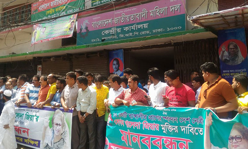 মানববন্ধনে বক্তব্য রাখছেন সিনিয়র নেতারা। তবে বক্তব্যের ফাঁকে ফাঁকে এবং বক্তব্যস্থলের আশপাশে খণ্ড খণ্ডভাবে স্লোগান দিচ্ছেন কর্মীরা। খালেদা জিয়া বন্দি হওয়ার পরপরই নেতাকর্মীরা তাঁকে ‘মা’ বলে সম্বোধন করে আসছেন।