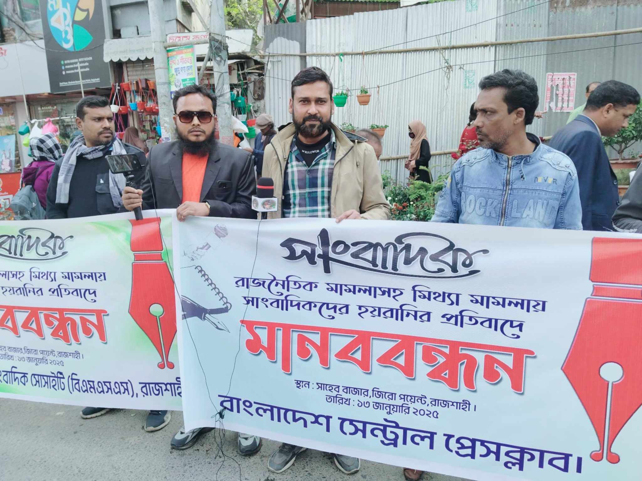 সোমবার(১৩ জানুয়ারি) রাজশাহী নগরীর জিরো পয়েন্ট এলাকায় বাংলাদেশ সেন্ট্রাল প্রেসক্লাব,জাতীয় সাংবাদিক সংস্থা রাজশাহী বিভাগ ও রাজশাহী মডেল প্রেসক্লাবের আয়োজনে রাজশাহীর স্থানীয় সাংবাদিক সংগঠনসহ রাজশাহীর বিভিন্ন জেলা ও উপ-জেলার সাংবাদিক সংগঠনের ব্যানারে এই মানববন্ধন করা হয়। মানববন্ধনে সাংবাদিকেরা বলেন, আমাদের সারা দেশের সহকর্মীদের নাই এইভাবে ঢালাও মিথ্যা মামলা প্রত্যাহার করা হোক। সাংবাদিকদের ভূমিকা না থাকলে চব্বিশের পরিবর্তন সম্ভব ছিলো না। পরিবর্তনের পর দেশের কিছু সুবিধাবাদী কুচক্রী মহল বিতর্কিত কর্মকাণ্ড ঘটানোর সুযোগ নেয়। চব্বিশের পরিবর্তনের পর বৈষম্য বিরোধী ছাত্র আন্দোলন ও বিভিন্ন রাজনৈতিক নেতারা বলেছিলেন দেশের কোথাও নির্দোষ ও সাধারণ মানুষের নামে হয়রানি মূলক মামলা করা হবে না। কিন্তু আজ সেটাই হচ্ছে।
