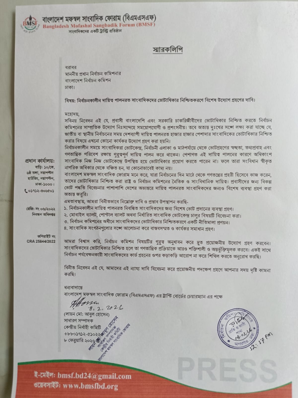 নির্বাচনকালীন সাংবাদিকদের ভোটাধিকার নিশ্চিতের দাবিতে নির্বাচন কমিশনে বিএমএসএফের স্মারকলিপি প্রদান