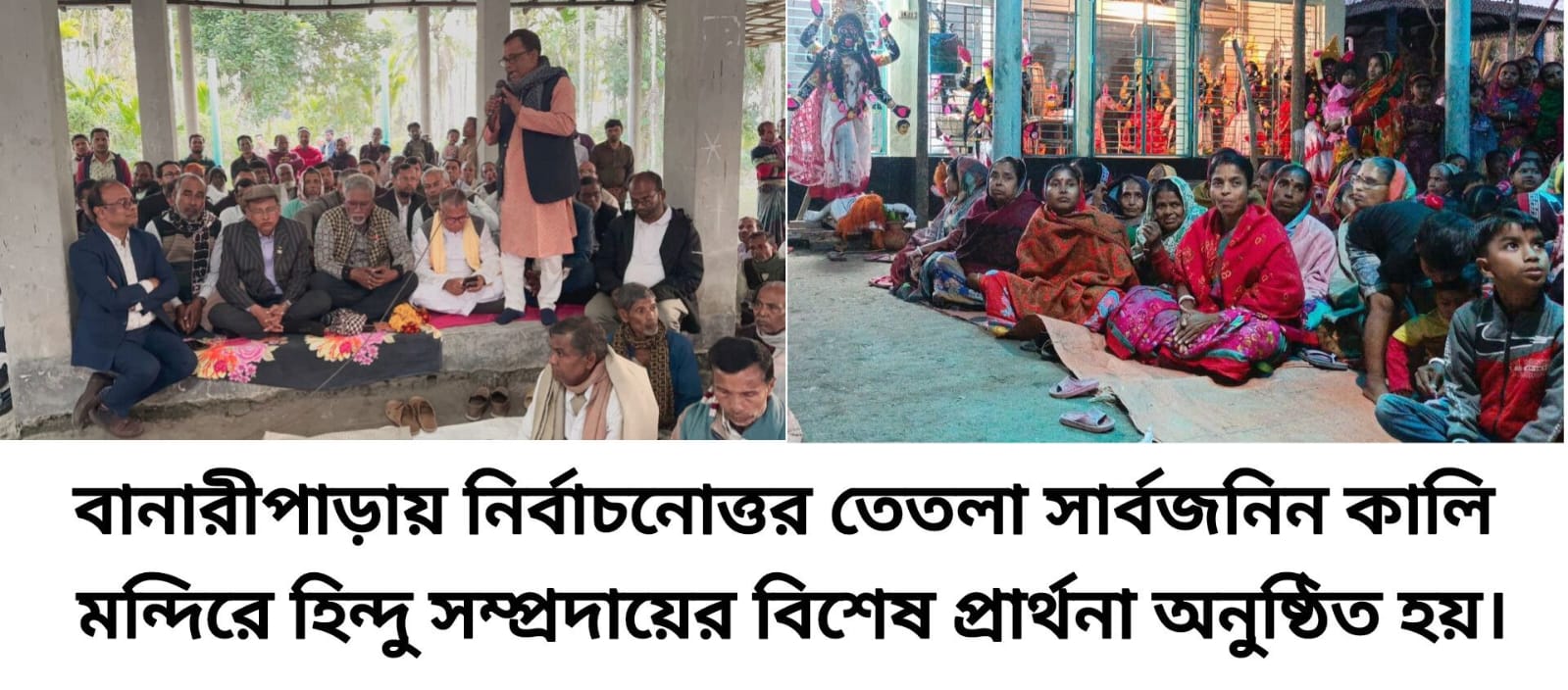 বরিশালের বানারীপাড়ায় শান্তিপূর্ণ পরিবেশে অনুষ্ঠিত ত্রয়োদশ জাতীয় সংসদ নির্বাচনোত্তর সাবেক প্রধানমন্ত্রী বেগম খালেদা জিয়ার বিদেহী আত্মার শান্তি ও ভাবী প্রধানমন্ত্রী তারেক রহমানের সুস্বাস্থ্য ও মঙ্গল কামনায় মন্দিরে বিশেষ প্রার্থনা অনুষ্ঠিত হয়েছে। শনিবার (১৪) ফেব্রুয়ারী সন্ধ্যায় উপজেলার উদয়কাঠী ইউনিয়নের তেতলা সার্বজনিন কালি মন্দিরে স্থানীয় হিন্দু সম্প্রদায়ের উদ্যোগে এ বিশেষ প্রার্থনা অনুষ্ঠিত হয়। এতে বরিশাল-২ আসনে বিএনপির নর্বনির্বাচিত সংসদ সদস্য এস সরফুদ্দিন আহমেদ সান্টুর সুস্বাস্থ্য এবং নতুন সরকার ও দেশের কল্যাণ কামনা করা হয়। প্রার্থণা সভায় প্রধান অতিথি ছিলেন বানারীপাড়া উপজেলা বিএনপির সভাপতি মোঃ শাহ্ আলম মিঞা। বিশেষ অতিথি ছিলেন উপজেলা বিএনপির যুগ্ম সাধারণ সম্পাদক মোঃ সাইফুল ইসলাম রকি। তেতলা সার্বজনিন কালি মন্দিরের সভাপতি বিমল হালদারের সভাপতিত্বে ও বলদিয়া মলুহার মাধ্যমিক বিদ্যালয়ের প্রধান শিক্ষক মিহির রায়ের সঞ্চালনায় অনুষ্ঠিত এ প্রার্থনা সভায় স্থানীয় হিন্দু সম্প্রদায়ের নেতৃবৃন্দ বক্তৃতা করেন।