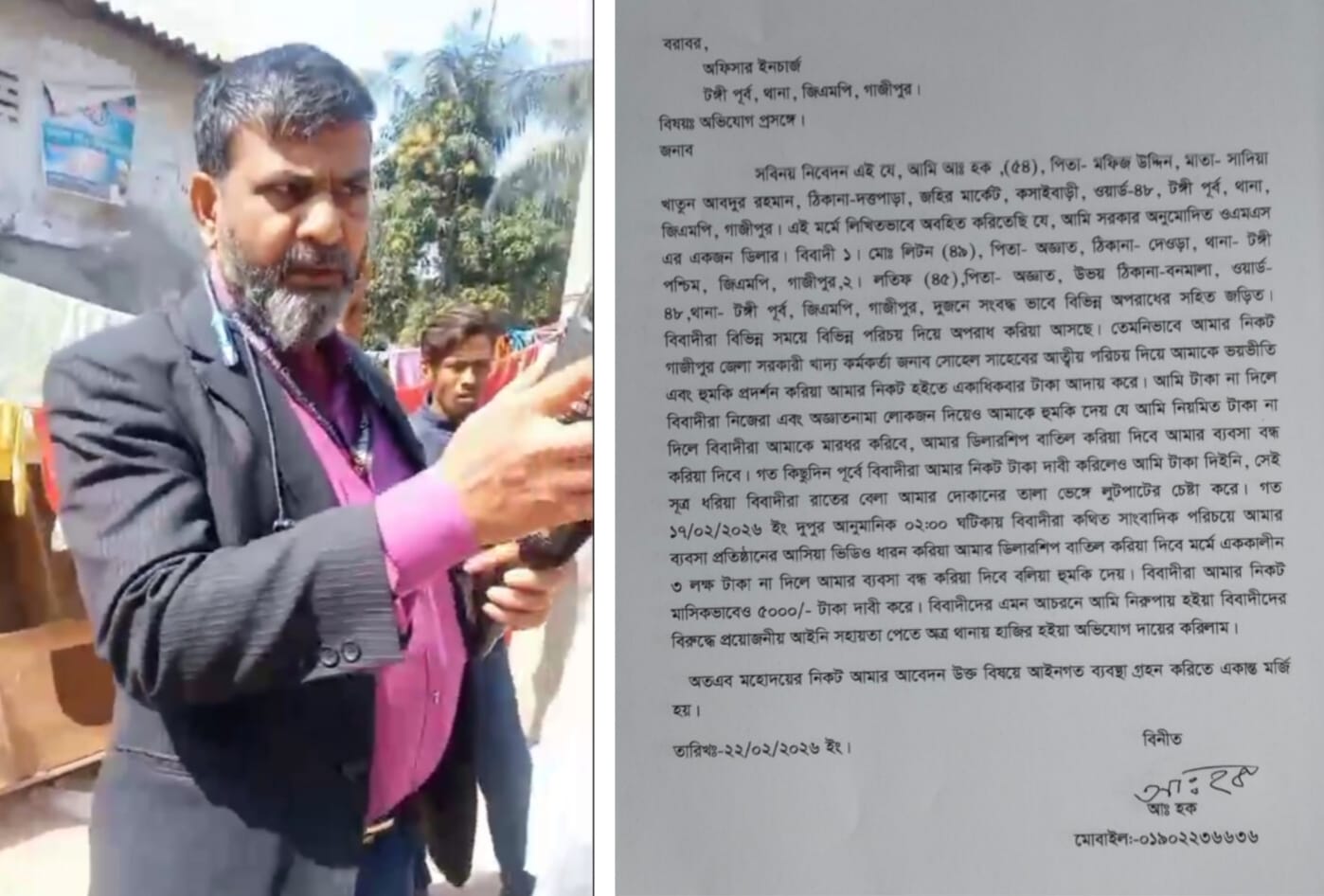 তিনি আরও জানান, সম্প্রতি টাকা দিতে অস্বীকৃতি জানালে অভিযুক্তরা রাতের বেলায় তার দোকানের তালা ভেঙে লুটপাটের চেষ্টা করে। এছাড়া গত ১৭ ফেব্রুয়ারি দুপুরের দিকে তারা কথিত সাংবাদিক পরিচয়ে তার ব্যবসা প্রতিষ্ঠানে গিয়ে ভিডিও ধারণ করে এবং এককালীন ৩ লাখ টাকা দাবি করে। টাকা না দিলে ডিলারশিপ বাতিল ও ব্যবসা বন্ধ করে দেওয়ার হুমকি দেওয়া হয়। পাশাপাশি মাসিক ৫ হাজার টাকা চাঁদা দাবি করা হয় বলেও অভিযোগে বলা হয়েছে।
