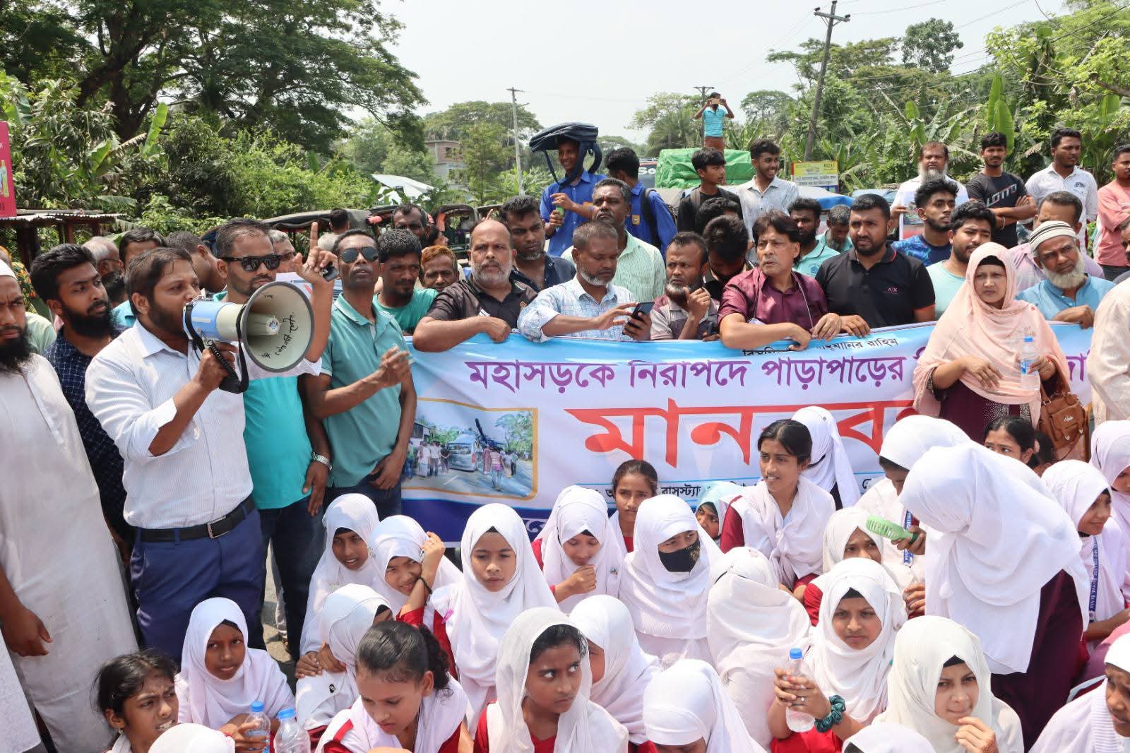মহাসড়কে নিরাপদে যাতায়াতের নিশ্চয়তা, জনগুরুত্বপূর্ণ স্থানে ফুটওভার ব্রিজ ও স্পিড ব্রেকার নির্মাণের দাবিতে বরিশালের গৌরনদীতে মানববন্ধন ও মহাসড়ক অবরোধ করে বিক্ষোভ করেছে স্থানীয় বাসিন্দারা।