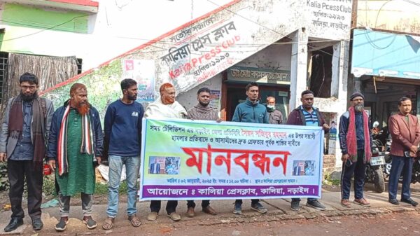 নড়াইল প্রতিনিধি: নড়াইলে সময় টিভির জেলা প্রতিনিধি সাংবাদিক সৈয়দ সজিবুর রহমান সজিবের উপর হামলার প্রতিবাদে কালিয়া প্রেসক্লাবের আয়োজনে মানববন্ধন অনুষ্ঠিত হয়েছে। বৃহস্পতিবার(২ জানুয়ারি )বেলা